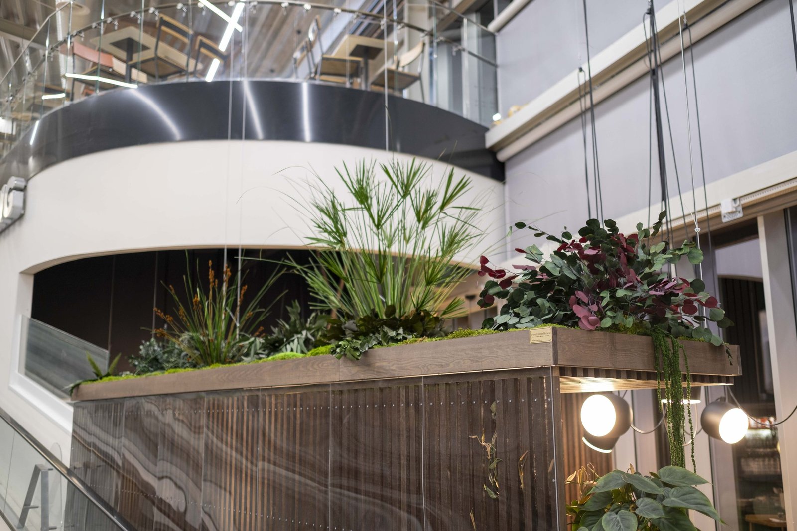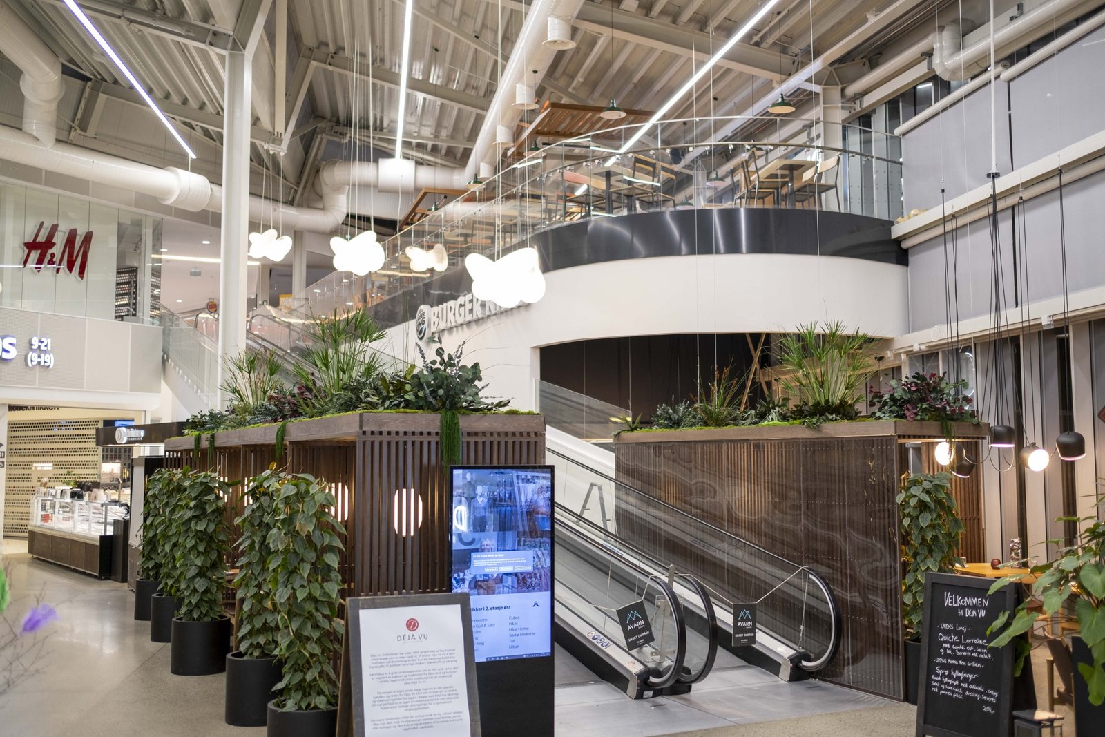 Detta arrangemang har vi arbetat fram åt kvadrat köpcentrun i Stavanger, Norge. De önskade en hållbar gröntak ovanför caféet vid Eltrappor på lobbyn med konserverade blommor som dekoration för en naturlig känsla i lobbyn. Som alltid valde vi lättskötta växter av hög kvalitet som inte kräver mycket underhåll.