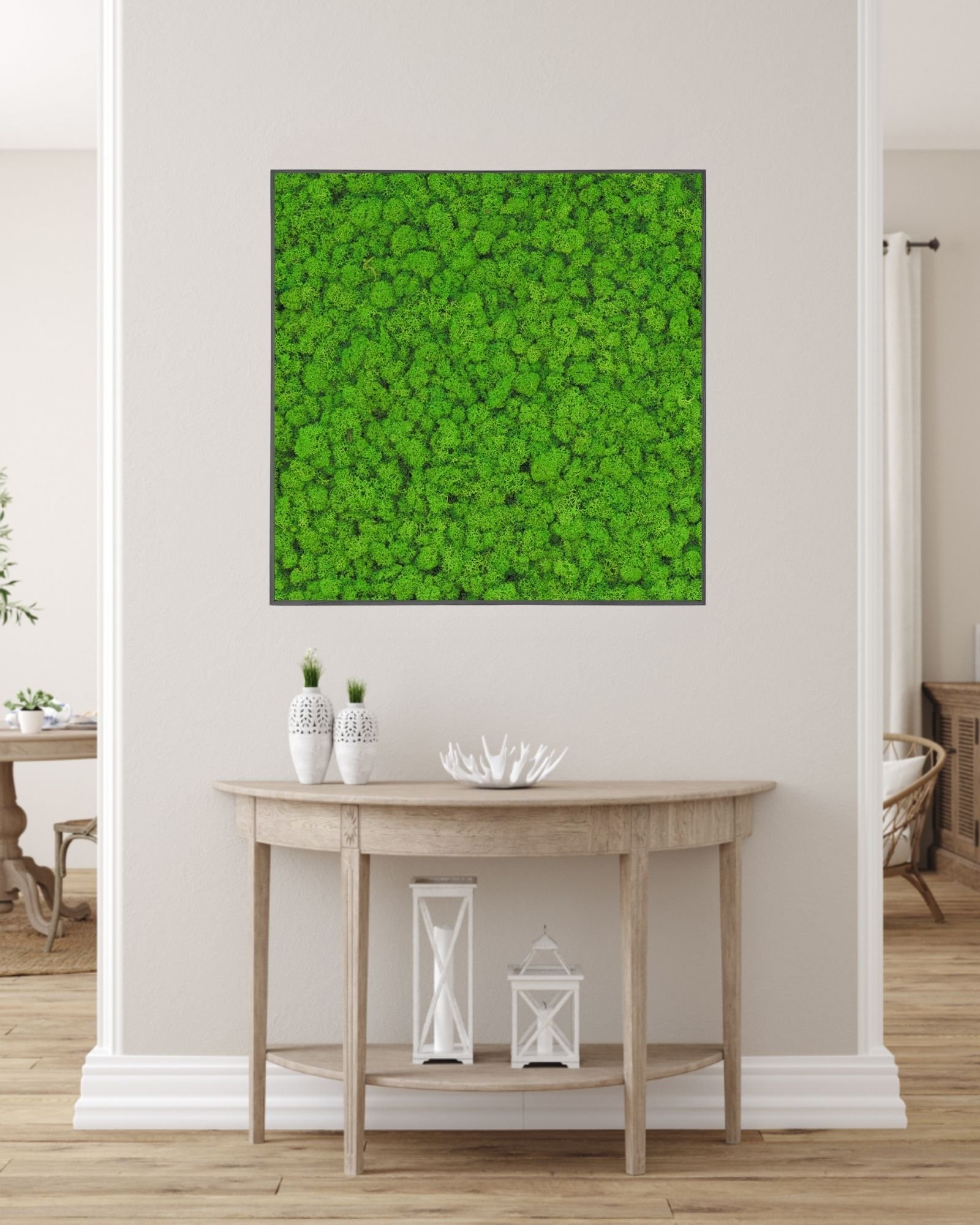 Firkantet mosplade med ægte finsk rensdyrlav. Kræver ingen vedligeholdelse, tilføjer naturligt grønt og elegance til dit interiør.